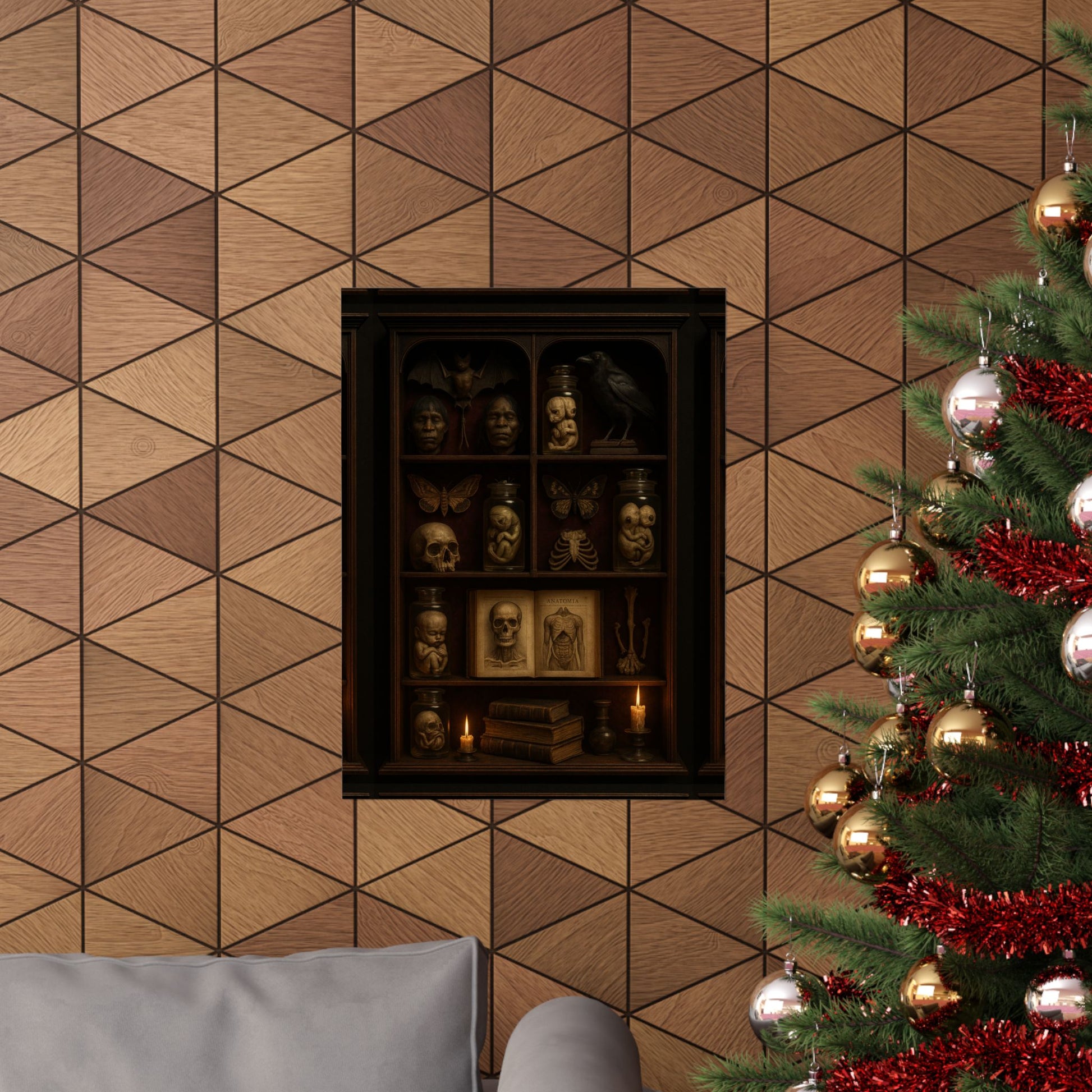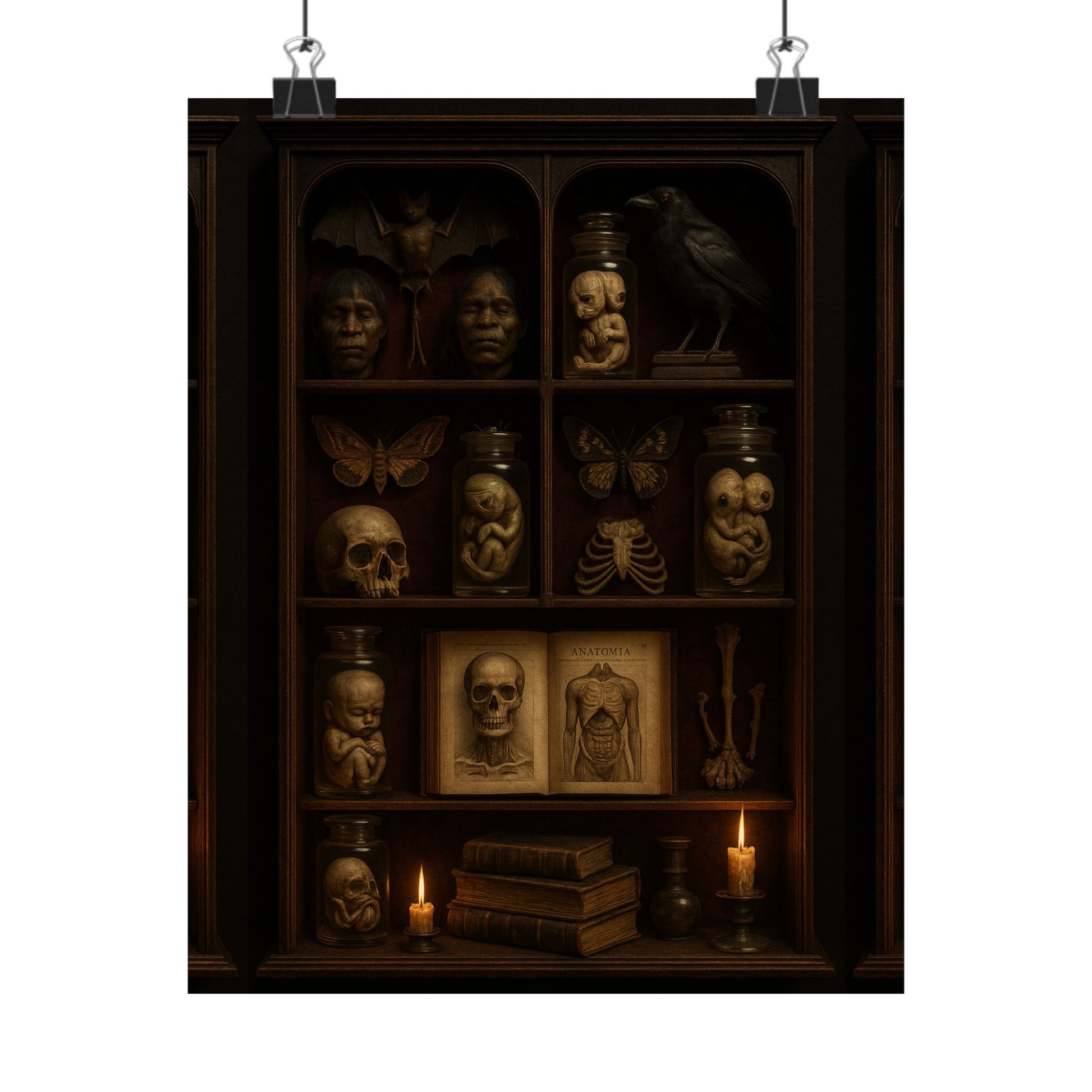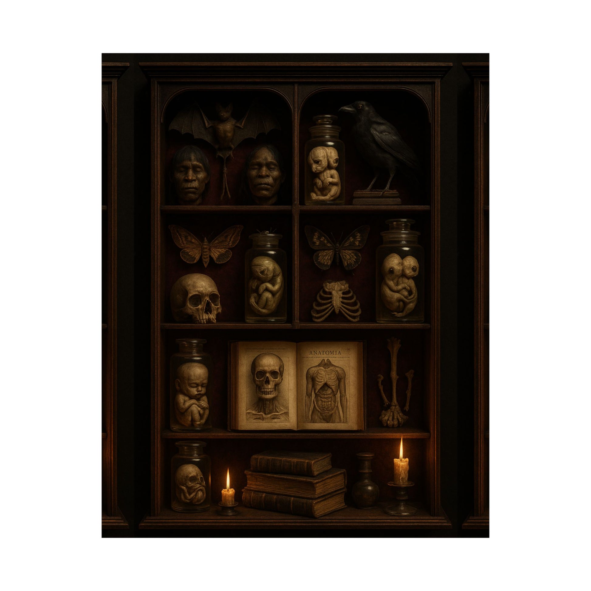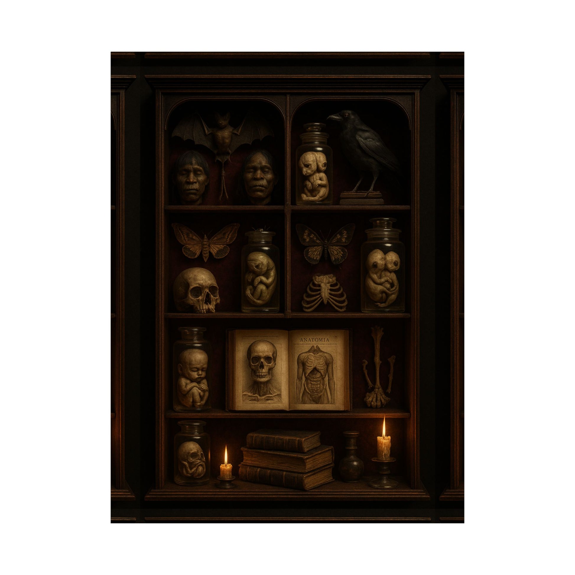 A brooding, museum-quality matte poster that brings a cabinet of curiosities to your wall. Deep, velvety shadows frame rows of preserved oddities — skulls, fetal studies, moths, a raven and other arcane artifacts — all rendered with rich, giclée color on archival paper. The low-reflective matte finish softens highlights so the piece reads like a studied still life under candlelight. It hangs quietly in a study, apothecary-style shelf, or reading nook, drawing long looks and sparking whispered conversations about the stories behind each specimen. Sized to your space and built to last, this poster feels like a found relic rather than a mass-produced print.