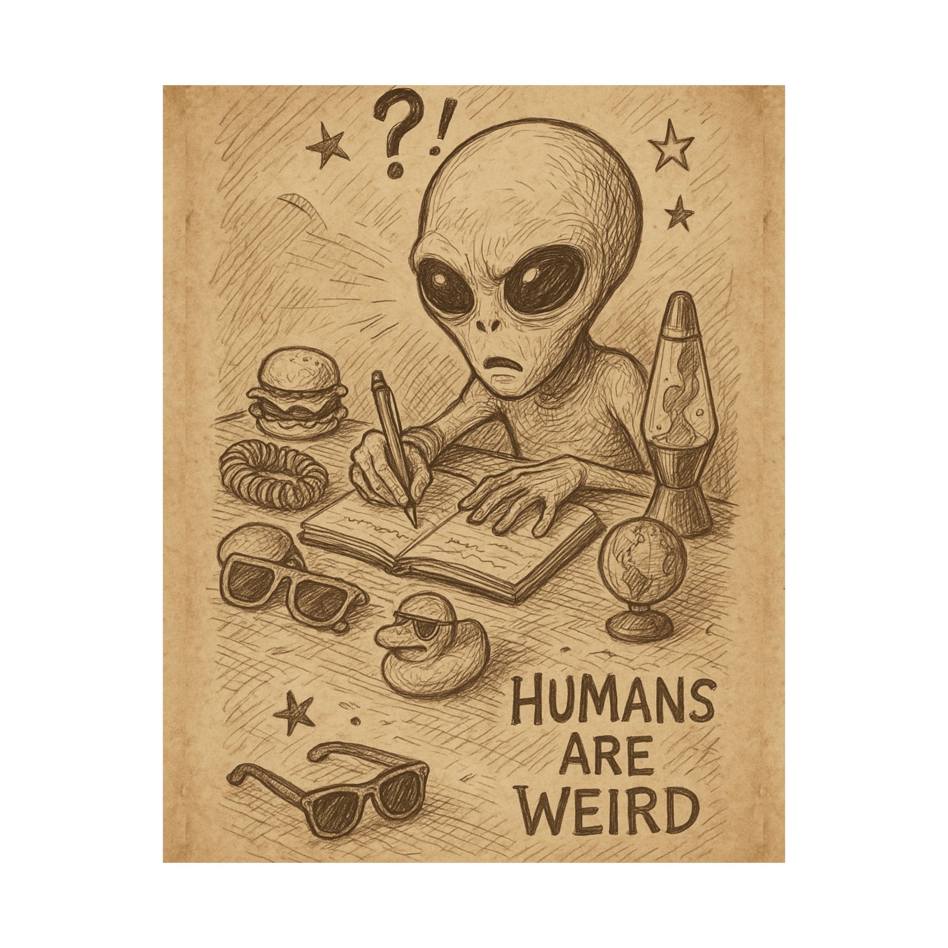 This matte vertical art print leans into playful oddity — a crisp, archival poster that puts a wry ‘Humans Are Weird’ message front and center, accompanied by curious aliens taking it all in. The imagery reads like a small, clever scene: extraterrestrial observers peering at everyday human quirks with gentle amusement. Hung in a studio, hallway, or shared living room, the print creates a conversational nook where friends pause and smile. Colors stay vivid thanks to giclée printing on museum-grade paper, while the matte finish keeps reflections low and the mood quietly sophisticated. Tailored for adult spaces and made to last, this poster arrives ready to anchor a wall that values humor, curiosity, and a touch of cosmic perspective.