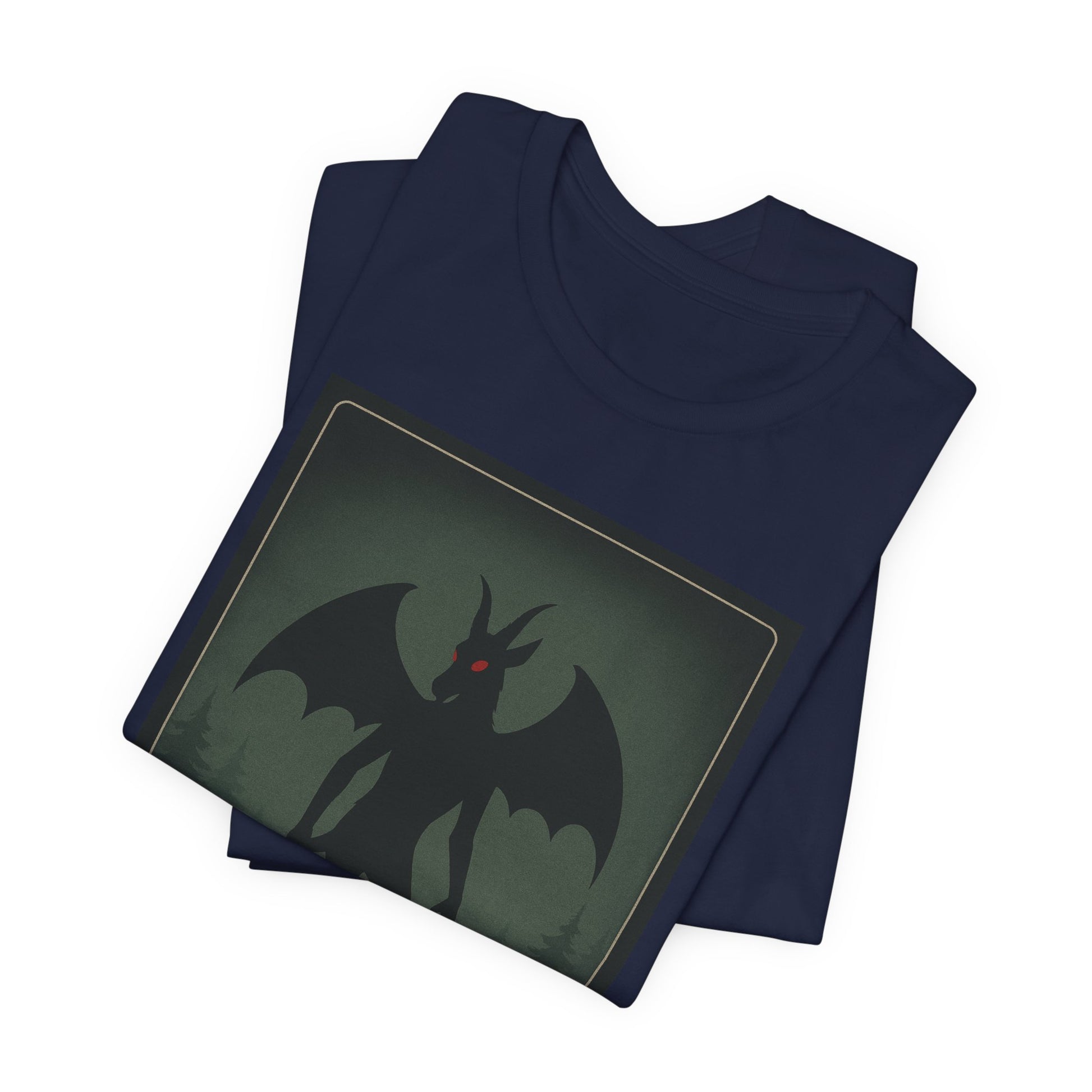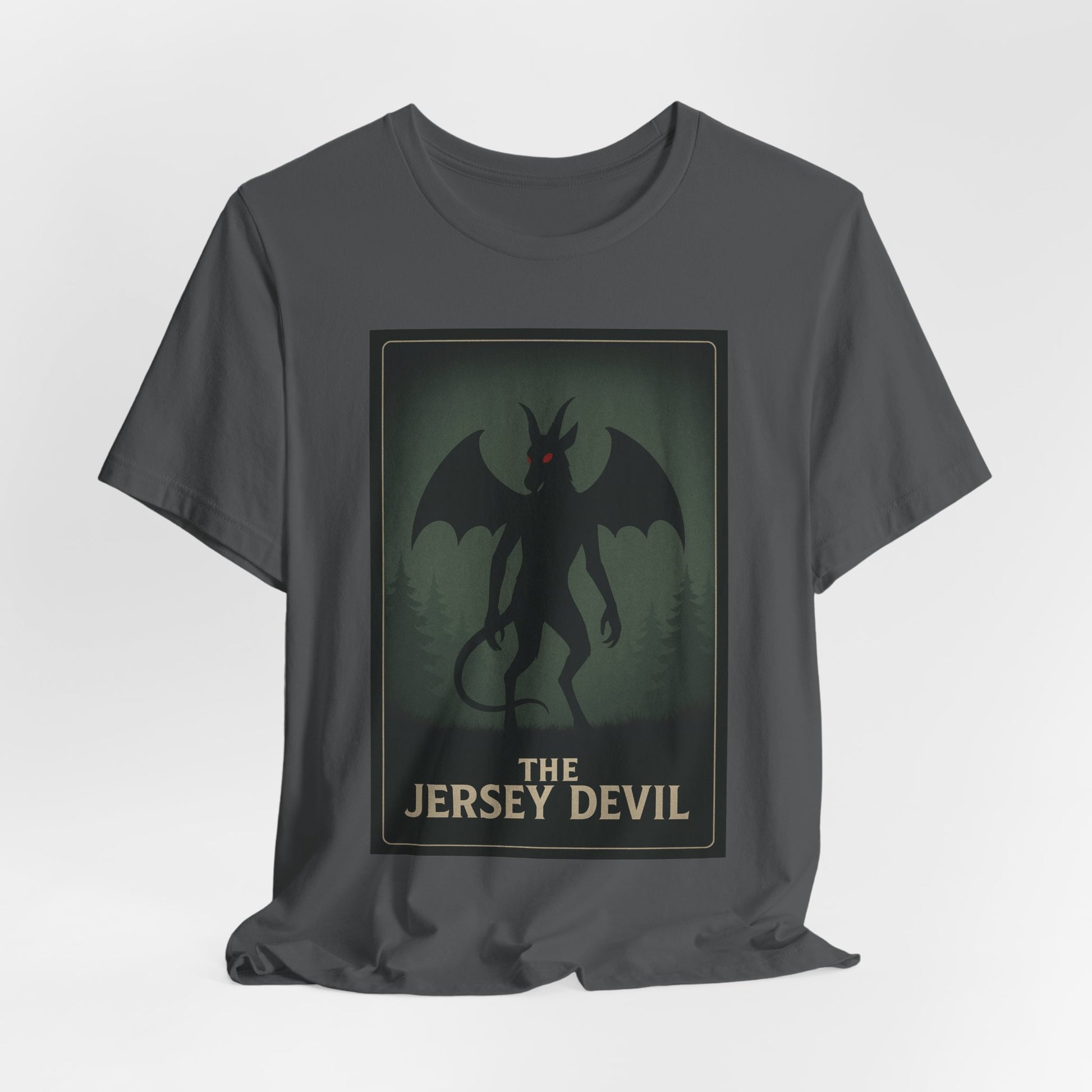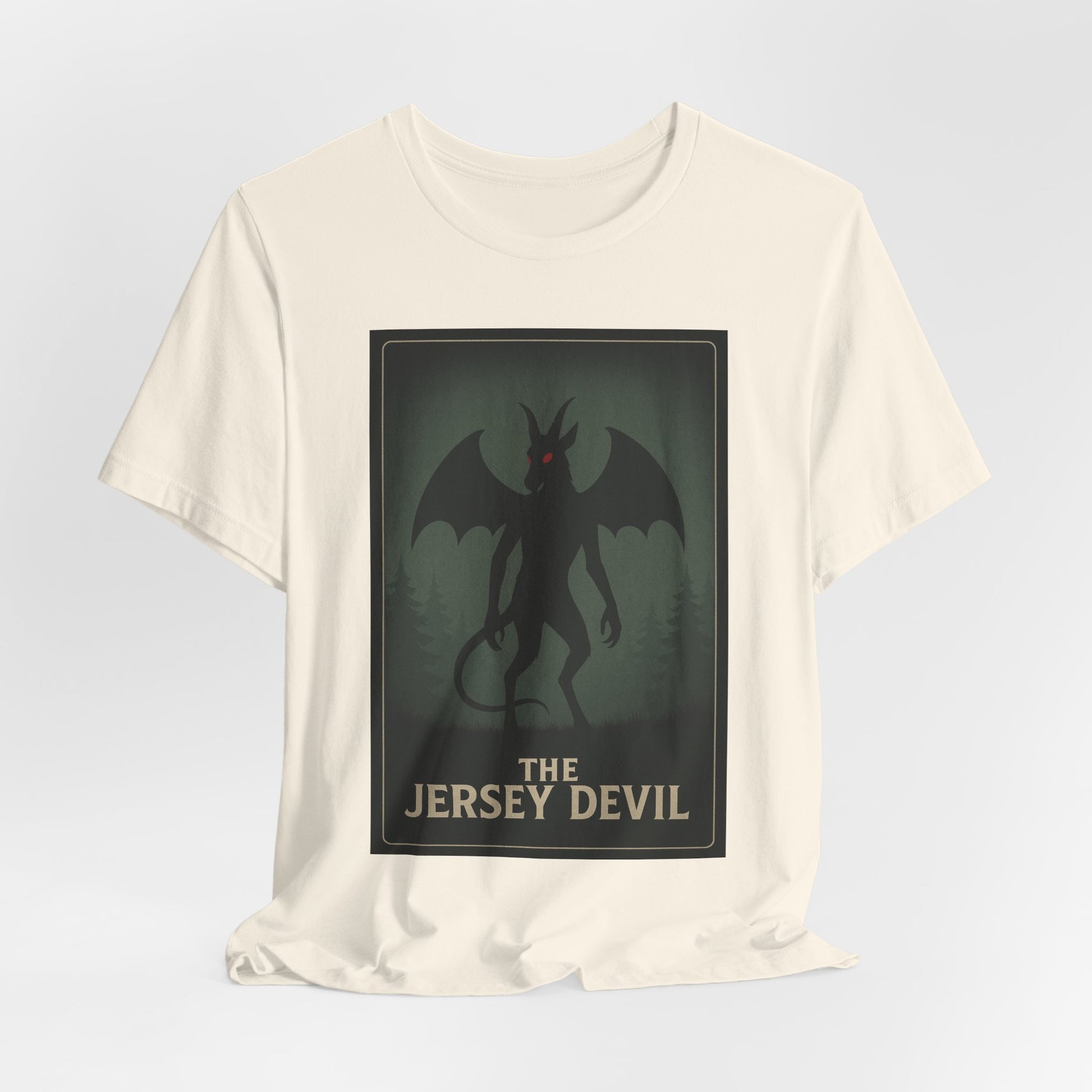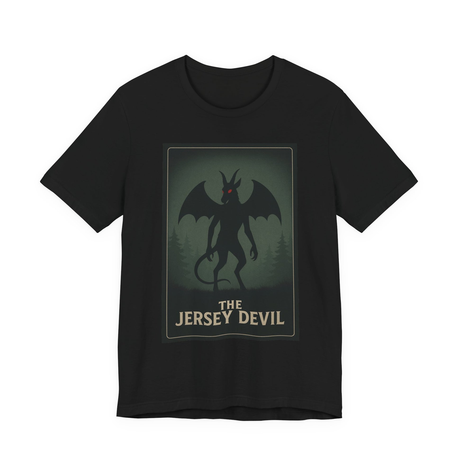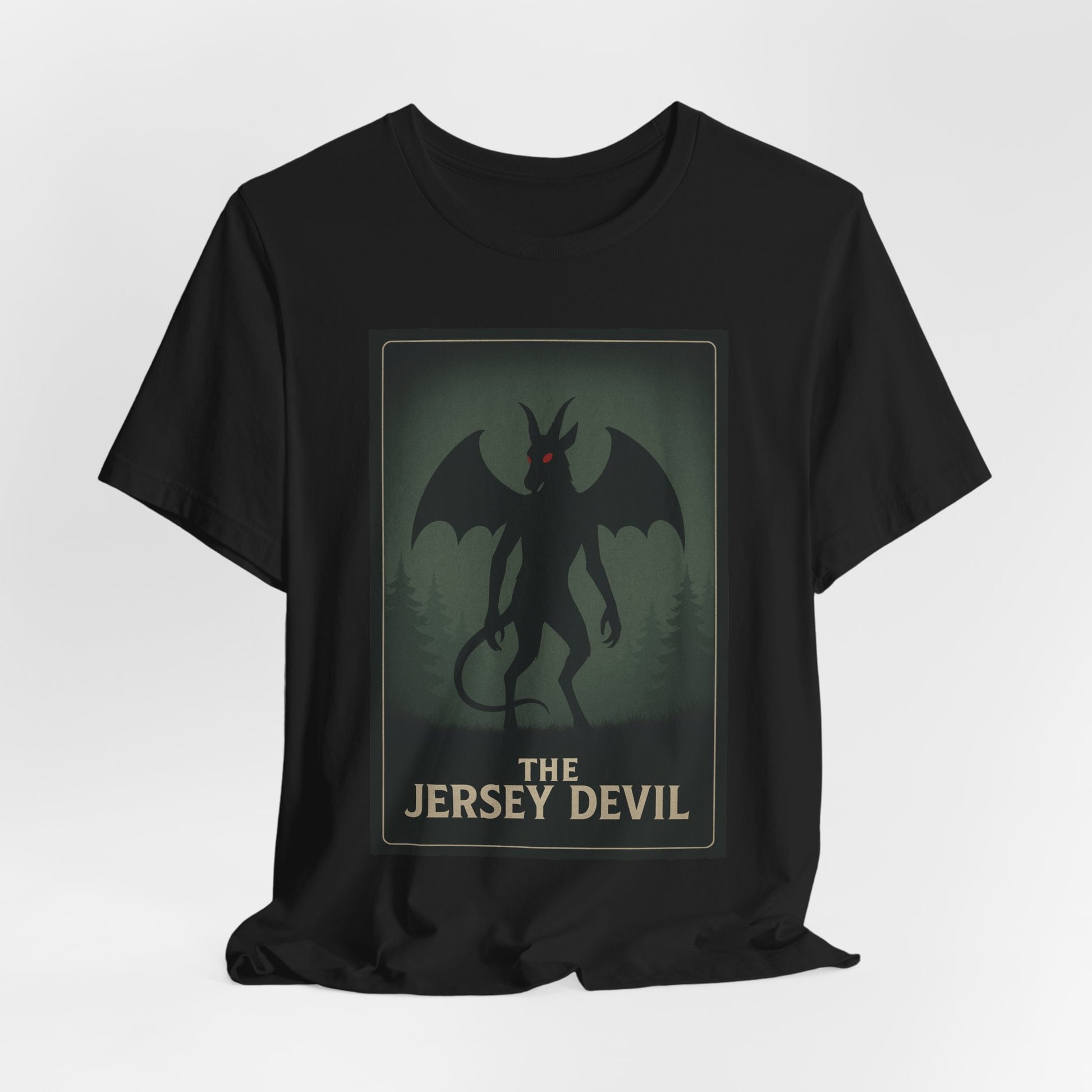 Step into the woods at dusk with this lightweight tee that carries a slow, thrilling chill. A muted poster-style graphic of the Jersey Devil—winged, horned, and watching from a foggy treeline—sits centered on soft black cotton. The image feels like an old roadside legend come alive: eerie, whispered, and impossible to ignore. Wear it on cool evenings by the campfire, to local ghost walks, or tucked under a jacket for city nights when you want a touch of folklore and mystery. The retail fit keeps the silhouette tidy without feeling stiff, while the tear-away label and breathable Airlume cotton keep comfort front and center. Subtle, slightly vintage tones let the design read as storytelling rather than loud branding—great for collectors of regional myth, cryptid fans, and anyone who likes their casual wear with a little narrative edge.