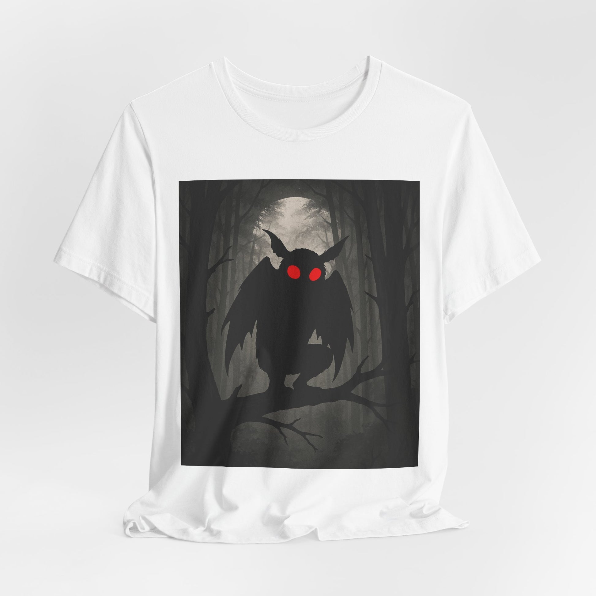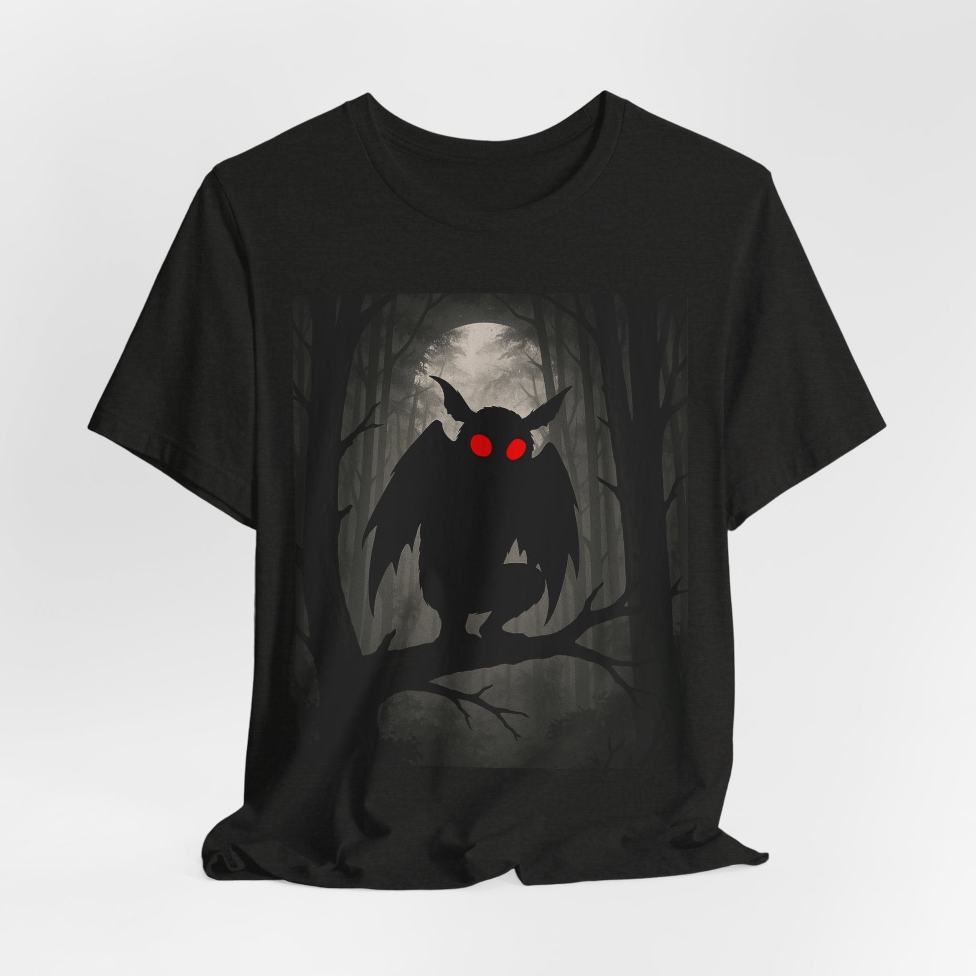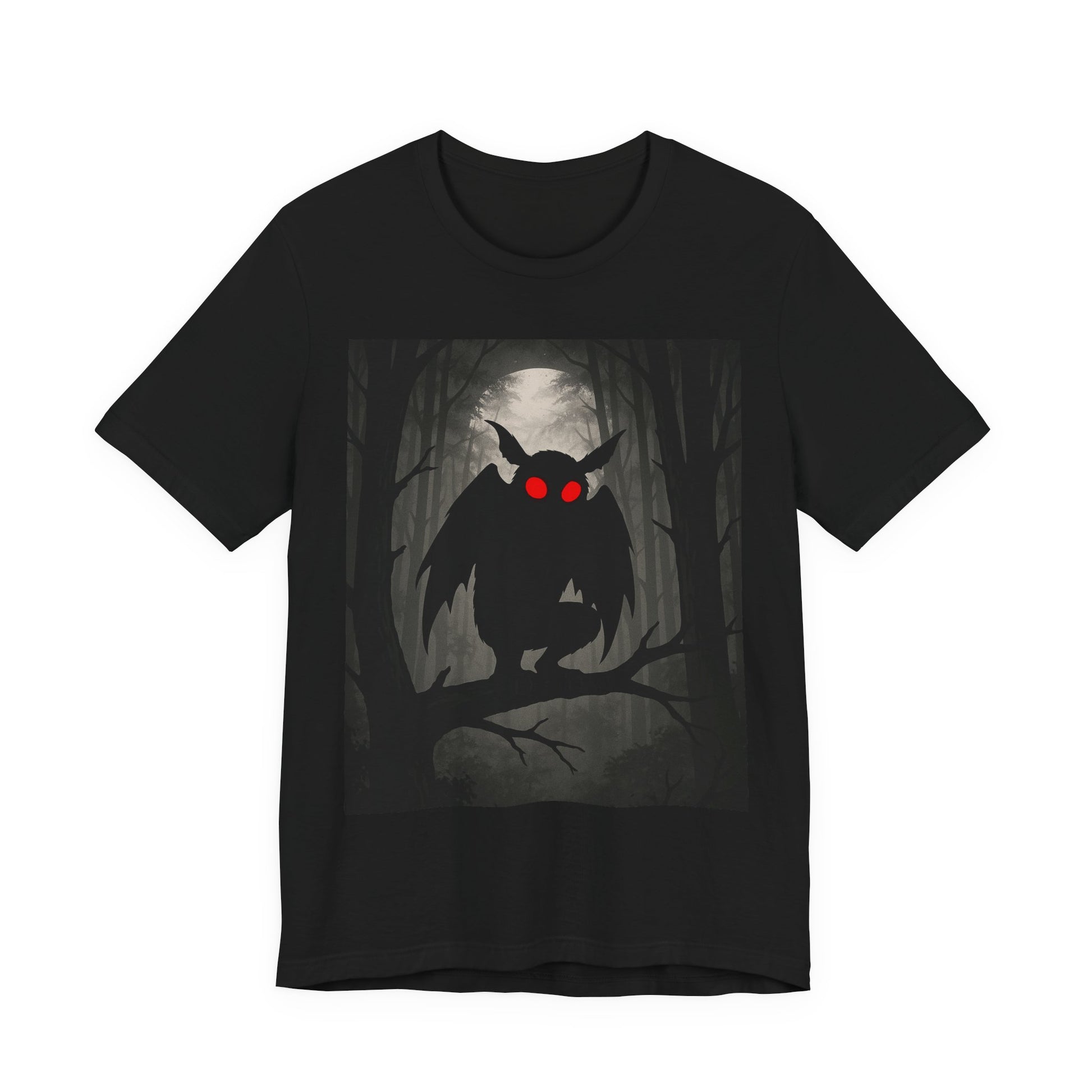 A lightweight, breathable jersey tee featuring a haunting forest illustration: a silhouetted owl with glowing red eyes perched on a twisted branch under a moonlit canopy. The slightly fitted retail cut and classic crew neckline keep the look clean and wearable, while the bold chest print adds an atmospheric, slightly eerie edge. Wear it layered under a flannel for late-night bonfires, or alone to let the dark, moody artwork speak. Ethically produced and soft against the skin, this shirt brings quiet, gothic energy to everyday outfits without sacrificing comfort.